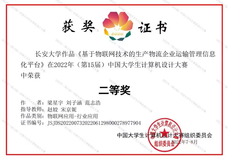 二等奖 | 基于物联网技术的生产物流企业运输管理信息化平台 | 物联网应用 | 梁星宇 刘子涵 范志浩 | 赵姣 宋京妮 | 运输工程学院 |