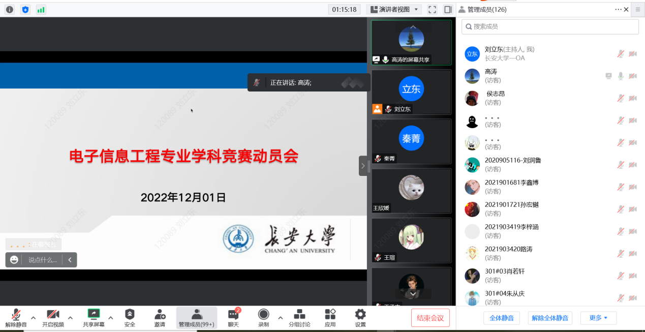 在当前疫情防控形势下,为提升大学生的实践动手能力,进一步加强电子信息工程本科专业学科竞赛指导宣传工作,电子信息工程系于2022年12月1日召开了电子信息工程专业学生线上学科竞赛动员会。电子信息工程系主任高涛老师、副主任刘立东老师、副主任秦菁老师以及该专业2020级、2021级全体本科生参加了动员会,高涛老师主持了会议。